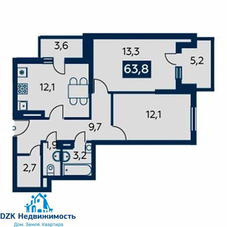 2-к. квартира, 63.8 м²
